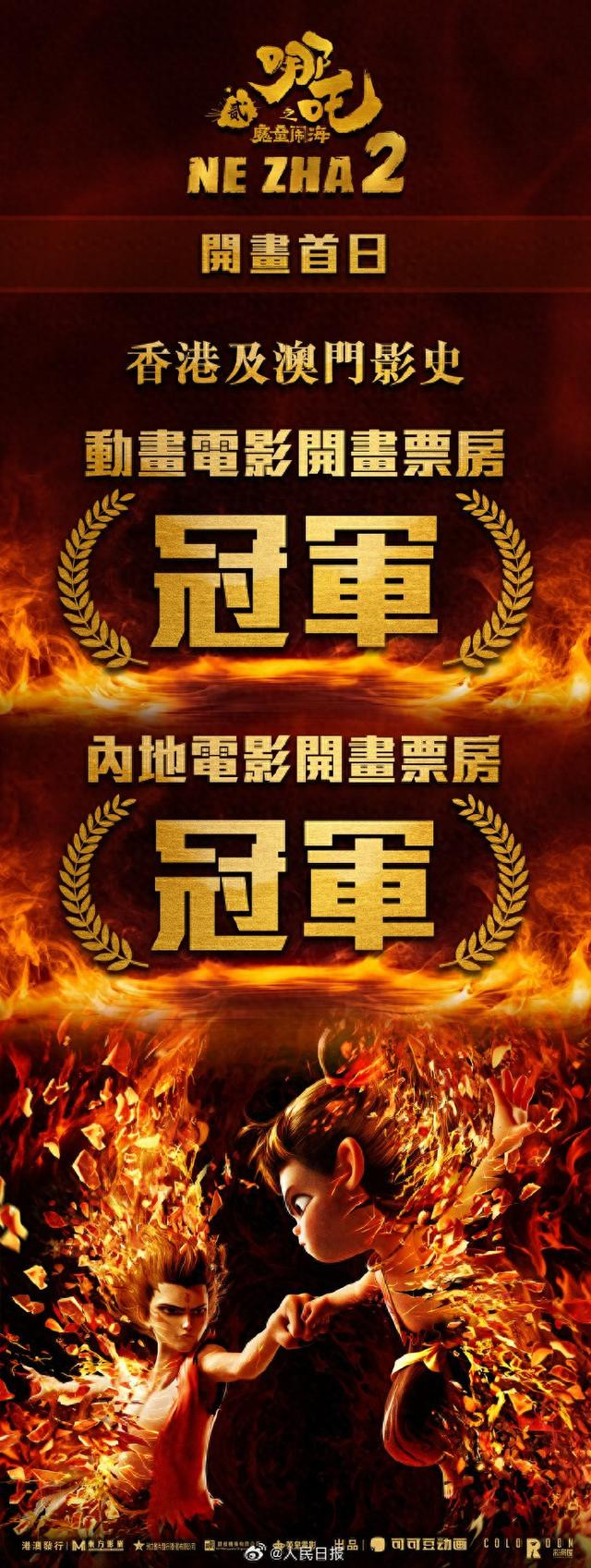 @电影哪吒之魔童闹海 发布港澳地区首日开画战报:《哪吒2》成为香港及澳门影史动画电影开画票房冠军、内地电影开画票房冠军。祝贺!